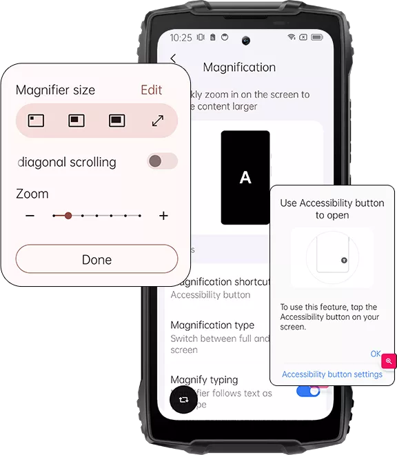*Magnification Type Magnify full screen /Magnify part of screen /Switch between full or partial screen