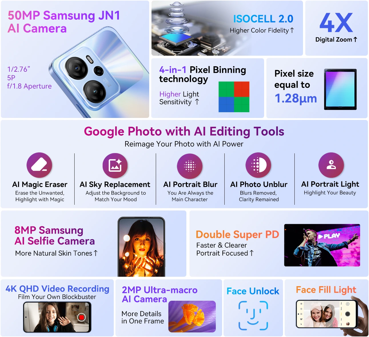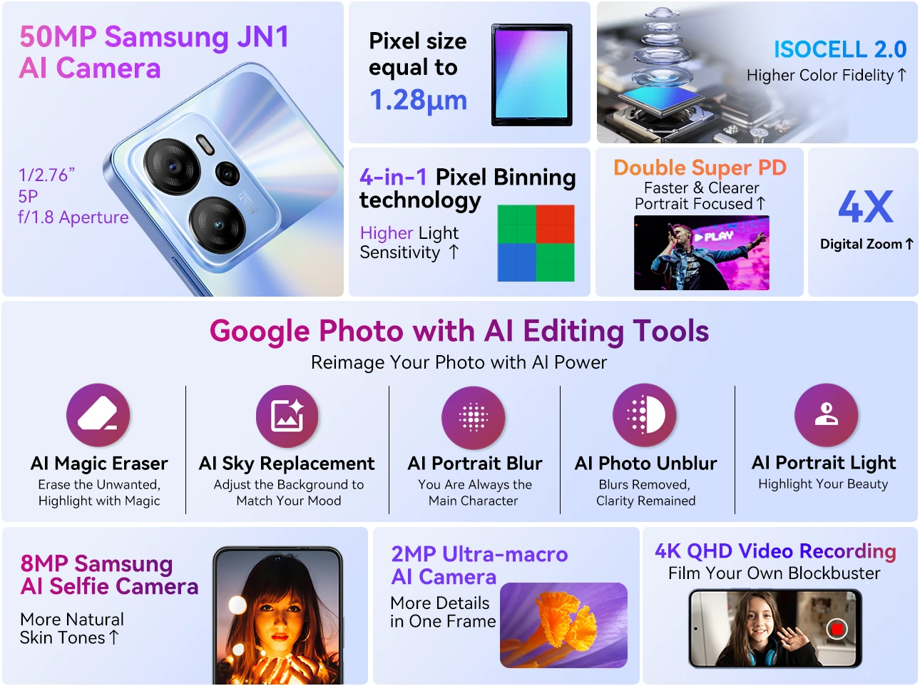 50MP Main Camera(samsung® JN1)&2MP Ultra-micro Camera(4cm)& 2Mp Depth Camera |