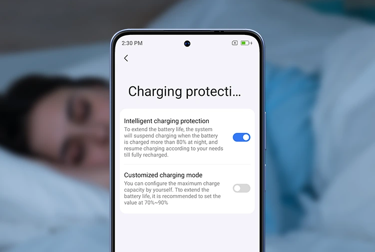 During nighttime charging, the system pauses at 80% and adjusts charging based on usage to preserve battery life.